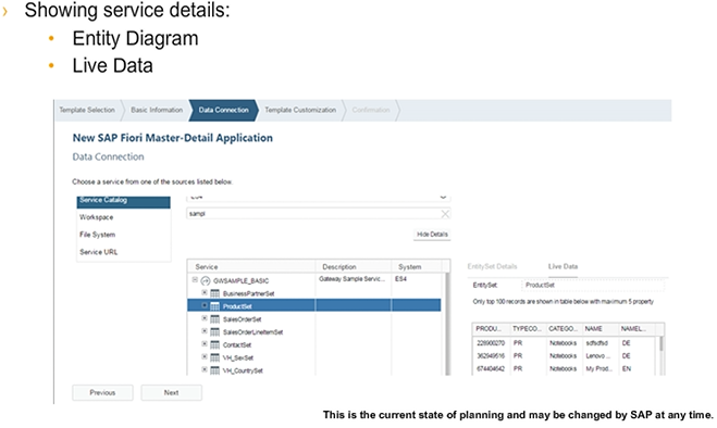 At this point, the UI developer is able to view the entity data model in a graphical way and is able to get a preview on the data that will be selected from the back-end system.