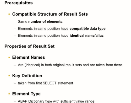 The CDS view in this example read customer ids from table SCUSTOM and from table SBOOK. In the first data definition keyword UNION ALL is used. The second CDS views read the same data but use UNION without additional ALL.