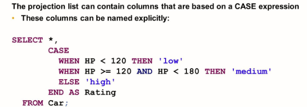 A special way of calculating column values is using a CASE expression. This expression allows you to determine a column value based on conditions, in other words, to include an IF-THEN-ELSE type of logic in the projection list.