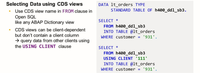 You can use the ABAP Dictionary name, respectively the SQL view name of the CDS view in the SELECT statement FROM clause. When using the new Open SQL syntax, you can, and are recommended to, use the CDS view name, as specified using the DEFINE VIEW keywords in the DDL source file.