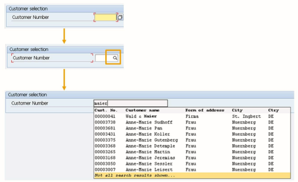 Starting with ABAP 7.4 SP03, the ABAP Dictionary search helps can be enhanced to support the so-called type-ahead search. If this is enabled for an input field on a screen, the system automatically proposes matching values when an end-user enters a few characters. You can identify input fields with type-ahead easily: the system displays a magnifying glass in them.