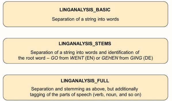 When creating the full-text index for linguistic search, you must also specify the level of linguistic analysis. This ranges from the separation of the string into its individual words, through stemming, which is the process of reducing a word such as going or went to its stem go, to a full linguistic analysis in which the individual parts of speech are tagged. For this analysis to work properly, Fast preprocessing must be switched off in the index definition. Fast Preprocessing is switched on by default when creating a full-text index using the SAP HANA studio.