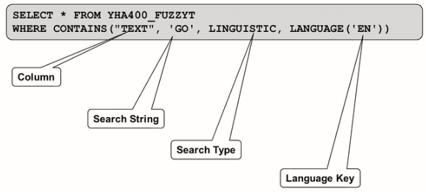To use the linguistic analysis in the SELECT statement, you again use the CONTAINS () function, but this time with the search type LINGUISTIC. Following the search type, you should use the LANGUAGE arguments to specify the language – once again as a two-character code. If you fail to do so or specify an invalid language-code, the search will be performed according to the linguistic properties of English.