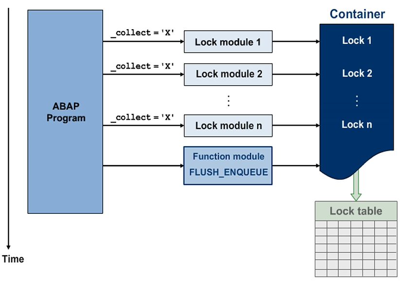 If all the lock requests are successfully issued, the system deletes the entire content of the lock container. If one of the locks in a container cannot be set, the FLUSH_ENQUEUE function module triggers the FOREIGN_LOCK exception. When the FOREIGN_LOCK exception is triggered, none of the locks registered in the container are set, and the container content remains complete for further dispatch attempts.