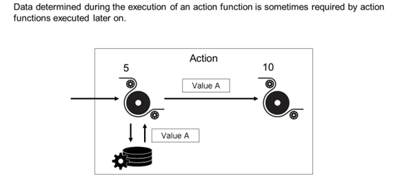 The figure shows an example: The first action function creates a customer. For this new customer, you should create an invoice. In order to create the invoice, you need the customer number.