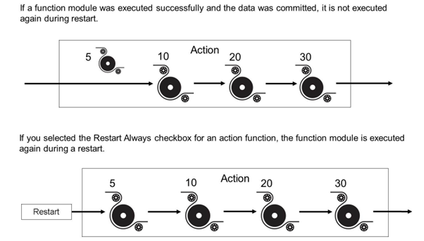For every defined action function, you can set the behavior in case of a restart. If you select the Restart Always checkbox for a function module of an action, this function module is executed when the processing of the data message is restarted. The function module is also executed if it was executed successfully in the previous run.