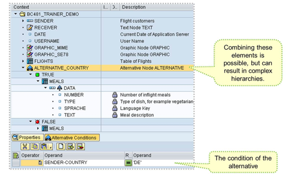 In the example above, the TRUE path is only processed if SENDER-COUNTRY = 'DE'. and only that rows of the internal table MEALS are transferred to the layout that match the DATA condition (example MEALS-SPRACHE = 'D').