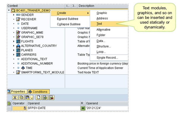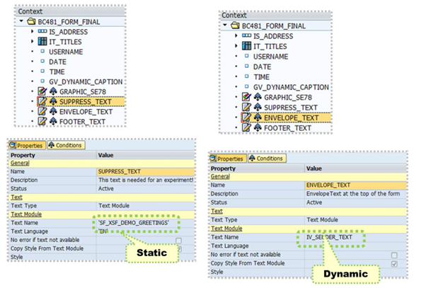 On the left: SF_XSF_DEMO_GREETINGS is a Smart Forms text module.