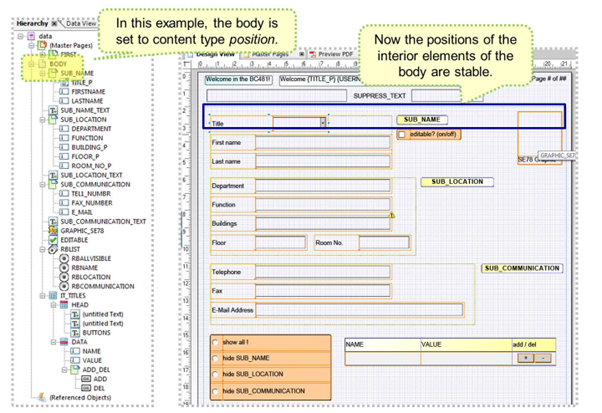 The content type of the subform BODY (the body page marked with blue borders) is set to “position.” This means that there is no dynamic floating content on the page that will overflow the dimensions of the content area. If this should be necessary, use content type “floating.”