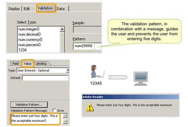 The error/warning is trapped by Acrobat, Adobe Reader, or Adobe document services, which returns a message to the user automatically. If an edit pattern has not been specified and the user input does not match LiveCycle Designer defaults, validation fails.