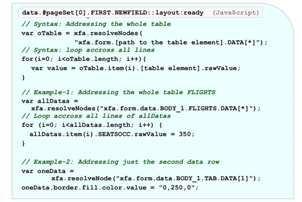 To dynamically access subforms like DATA with index numbers, you can build up a dynamic SOM expression as follows:var nIndex = 0;var dynSom = “TAB.DATA[” + nIndex + “].SEATSOCC”;var oData = xfa.resolveNode(dynSom);oData.rawValue = 350;