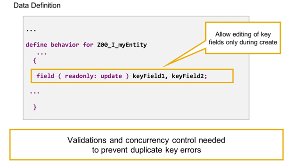 To ensure that the consumer can edit the primary key during create operations, but not during update operations, the primary key fields should be listed in the entity behavior body after the keyword readonly: update).