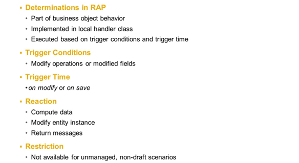 A determination is an optional part of the business object behavior that modifies instances of business objects based on trigger conditions. Determinations, like actions and validations, are defined in the behavior definition of the RAP BO and implemented in the behavior pool through a dedicated method of the local handler class.