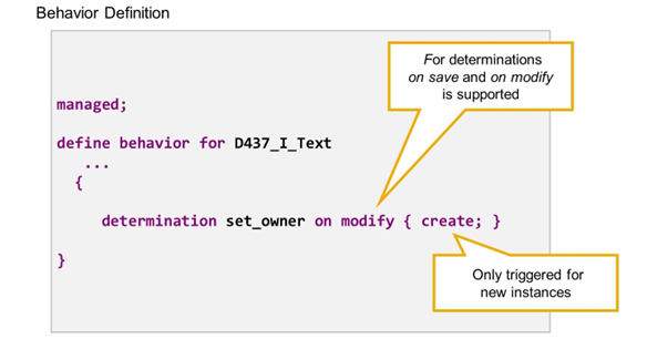 Determinations are defined in the entity behavior definition with the following statement: determination { }.