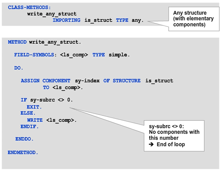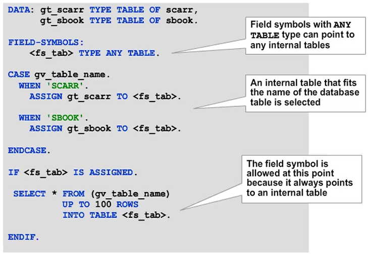 Generic typing enables the field symbol to refer to data objects with different types. As a result, you can address different data objects in the same operand position of an ABAP statement.