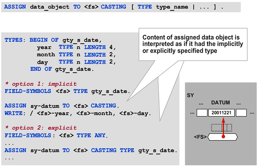 If the CASTING TYPE addition is used when assigning a data object to a field symbol that has a different type, the data object can be accessed using the field symbol as if it has that explicitly specified type.