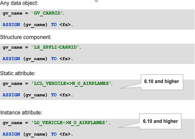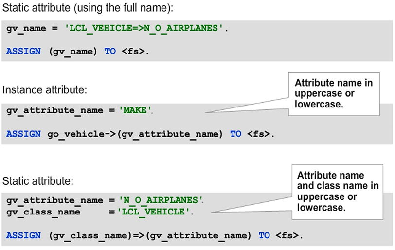 This approach indirectly makes it possible to call the data object dynamically by its name. You have to assign a generically typed field symbol to the data object using the syntax in the figure. Then use that field symbol in the ABAP statement. There are easier and less error-prone alternatives to specifically access attributes and structure components.