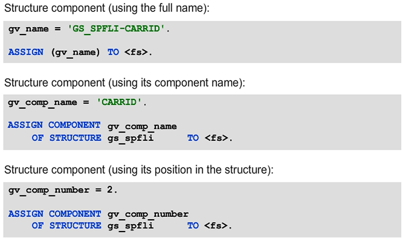 A special variant of the ASSIGN statement provides access to structure components dynamically. You specify the structure statically or through a separate field symbol in the ASSIGN COMPONENT ... OF STRUCTURE ... statement. Address the components either by name or by position (number) within the structure.
