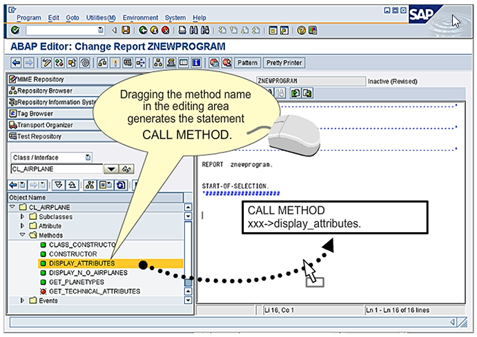 Alternatively, you can also choose the Pattern button. The CALL METHOD statement is under ABAP Objects Pattern. You can generate the statement using the input help.