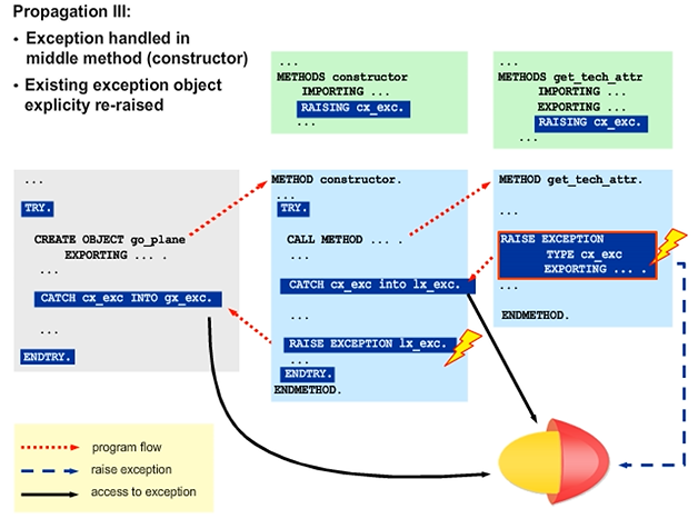 In the example, the constructor catches exception CX_EXC, which is raised by the GET_TECH_ATTR method. The constructor analyzes the exception object, performs necessary adjustments, issues a warning, and so on. The constructor then decides to pass the exception to the main program, where the exception is handled again.