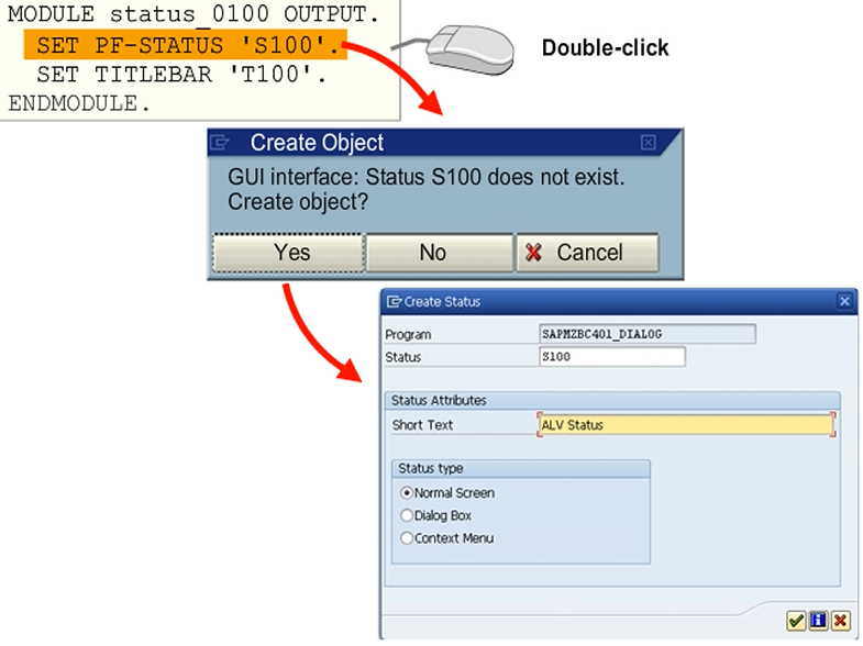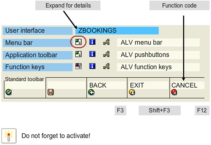 If you are only using a screen as a basis for an ALV in a container, it is sufficient to define a minimal status. As a minimum, the Back, Cancel, and Exit functions should be activated. It is good practice to include these functions in the standard toolbar, so that they are automatically assigned to the appropriate function keys, and to integrate them in the menu.