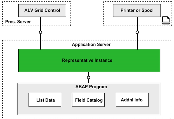 The communication between the representative instance in the ABAP program and the ALV Grid on the presentation server takes place interactively at runtime.