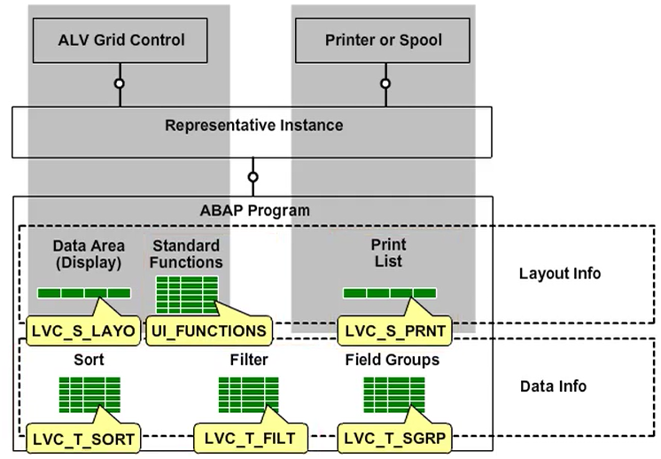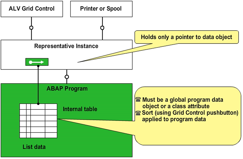 The representative instance in the calling program performs all interactive actions of the instance on the presentation server on the internal table, such as sorting, filtering, and so on. The lifetime of the internal table that contains the list data must be as long as the lifetime of the representative instance or longer.