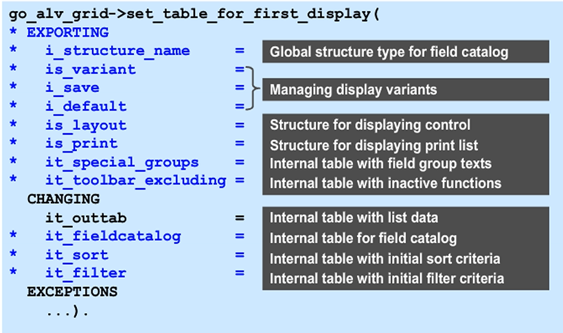 You use the set_table_for_first_display method to pass the list data, the field catalog, and other additional information to the representative instance. You pass the list data that you want to display with the it_outtab parameter.