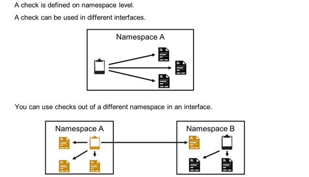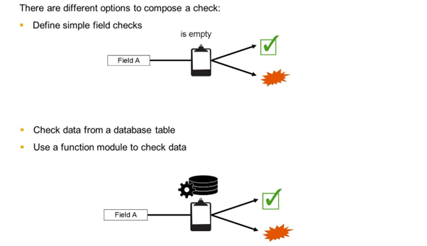 In the SAP Application Interface Framework, a check has a well-defined input (up to five field values) and a well-defined output (a success checkbox indicating the result of the check), and they remain independent of the context in which they are used. As a result, checks can easily be reused by several interfaces in the SAP Application Interface Framework.
