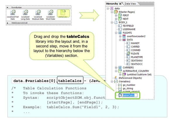 Drag and drop the tableCalcs element from the library into the layout and, afterward, drag it into the hierarchy. You must do this in two steps. It is not possible to drag the functions directly into the hierarchy.