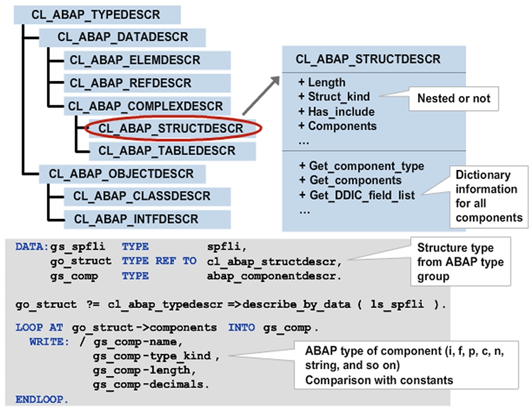 The CL_ABAP_STRUCTDESCR class also has a number of public attributes with basic information, such as the total length in bytes, the existence of includes, the type of structure (nested or not), and so on. The COMPONENTS attribute is an internal table that contains the names of all components and their elementary technical properties. You can use the GET_DDIC_FIELD_LIST method to determine the semantic information (if any) for the components. It is similar to the GET_DDIC_FIELD method, but returns an internal table instead of a structure.