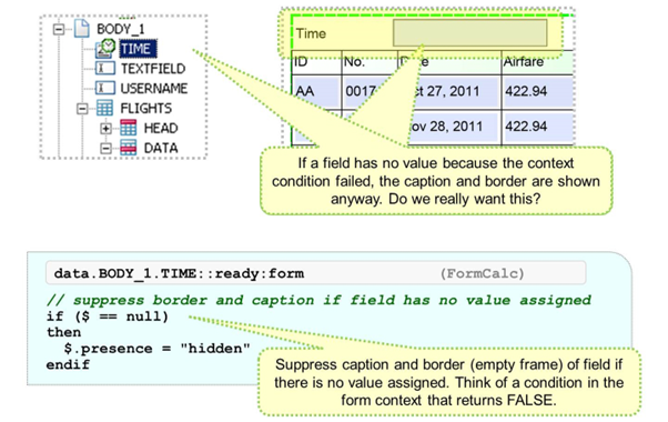 To solve this problem, scripting can be coded with the following condition: “$ == null”. If this returns TRUE, the “presence” attribute can be used to suppress the appearance of the empty field.