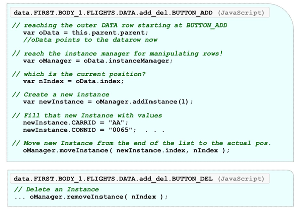 oData has a subobject or property instanceManager to manage further or existing instances. The manager's methods addInstance, removeInstance, and moveInstance can be used to manipulate the table and its rows.