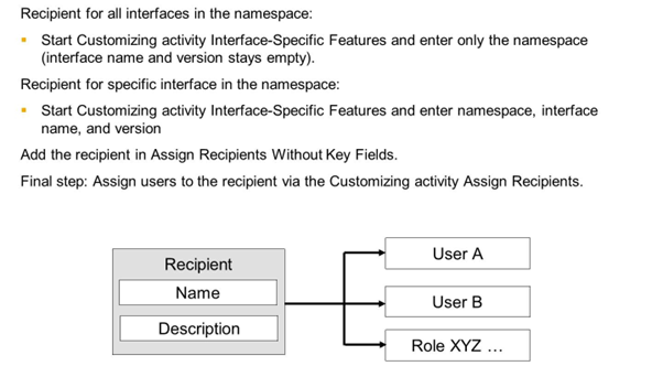 After you have created the recipient and assigned the interfaces, the users have to be assigned. In Customizing for AIF, go to System Configuration → Assign Recipients.