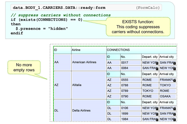 The EXISTS function is exactly what we need to suppress the inner table if there are no flight connections for the nested CARRIERS table.