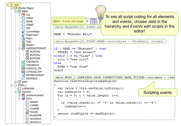 This figure shows a valuable navigation tip. Select the root node data in the hierarchy and select Events with scripts. All pieces of scripting will be shown at once.