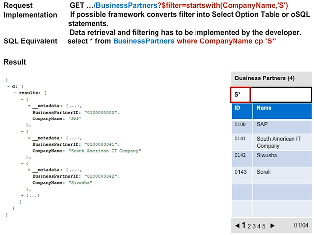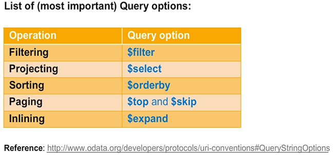 The next section explains how to reduce the data volume transferred from the server to the client by filtering data sets and by selecting the relevant data properties only. Paging is another way to reduce data traffic, and sorting guarantees the right sequence of the entities within a requested entity set.