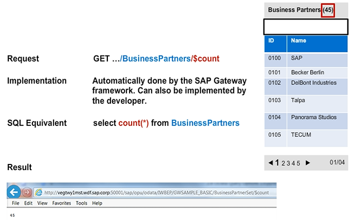 All of these query options can be used in patterns we frequently find in lightweight UIs. Let’s focus on the query option $count. The use case is to retrieve the number of entries of a collection. This way the client developer can show the user how many objects were found.