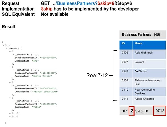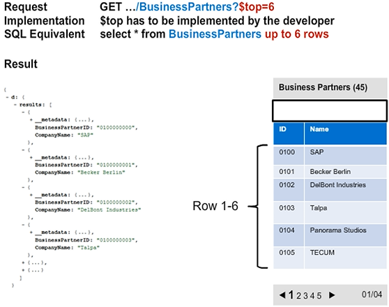 The client retrieves only six items ($top) but skips the first 6 and therefore starts with Business Partner No 0106.