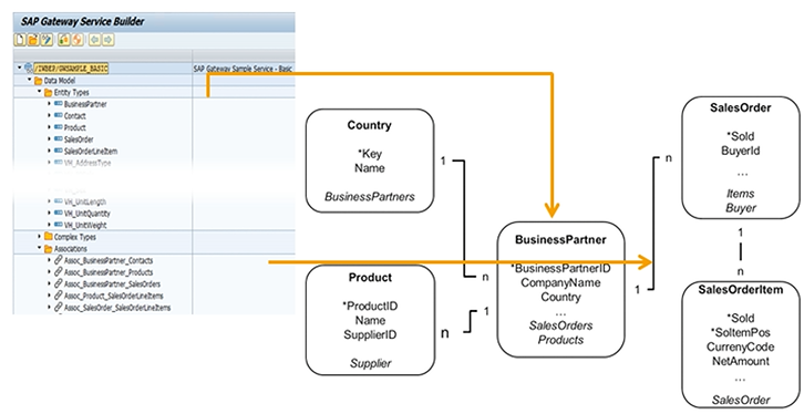 In the figure, the example entity data model consists of the five entity types: Product, BusinessPartner, SalesOrder, SalesOrderItem, and Country (not yet modeled in the Service Builder). The data model has the following characteristics: