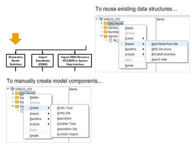 You can import an ABAP Dictionary structure to create entity types and complex types in your data model. You can reuse existing Function Module parameters and BAPI parameters to create entity types with ease.