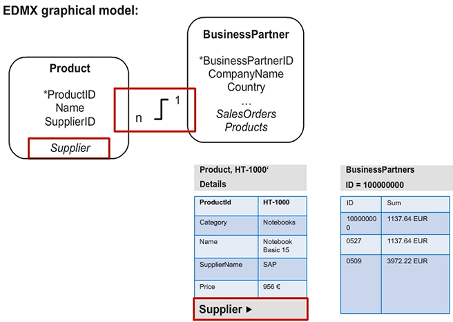 A product is delivered by one supplier. From the UI that shows the details of a product, we want to navigate to the supplier of that product. In the figure, we see that one business partner (1) can deliver several products (n).
