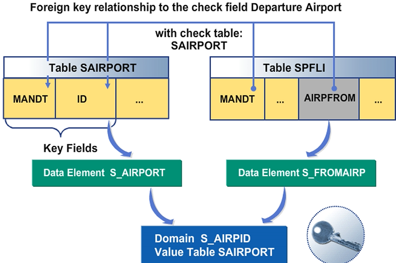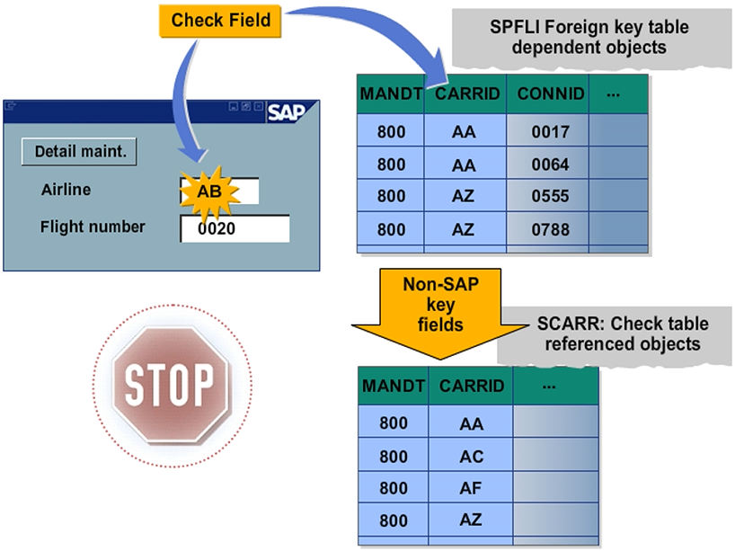 Foreign keys are only checked by the system during screen input and screen value help. In contrast to that, ABAP programs are able to modify database table content ignoring foreign keys. For example, a new entry is to be made in table SPFLI (flight schedule). There is a check whether the airline carrier entered is stored in table SCARR (carrier) for field SPFLI-CARRID. The record is only copied to table SPFLI (foreign key table) if this is the case. A foreign key is defined for field SPFLI-CARRID (check field); for example, the checks are on this field. The corresponding check table is table SCARR with the primary key fields CLIENT and CARRID.