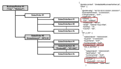 In our example, $expand would be used to either retrieve all sales orders of a business partner or all items of a sales order or, as a third use case, all sales orders including all their items of several business partners (or all sales order items of all sales orders of all business partners, if you want to stress the system).
