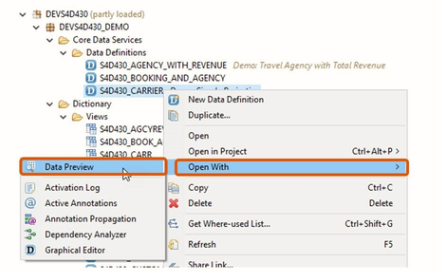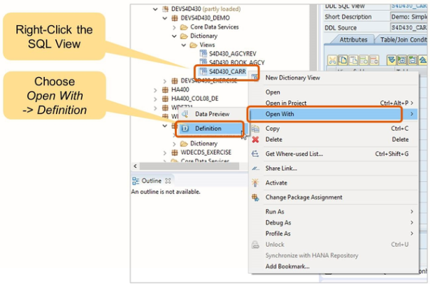 If you have located an SQL view and want to know how it is defined, right-click the SQL View in the project explorer and choose Open with -> Definition.