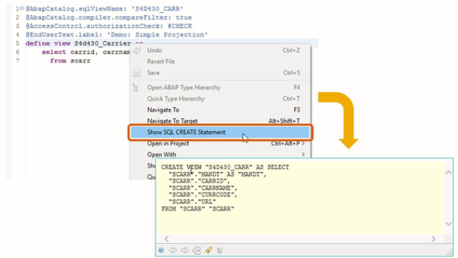 The SQL view is visible as an object in the ABAP Dictionary where it cannot be edited and only reveals a fraction of the information available in the DDL source. It serves as a representative of the database object.