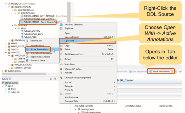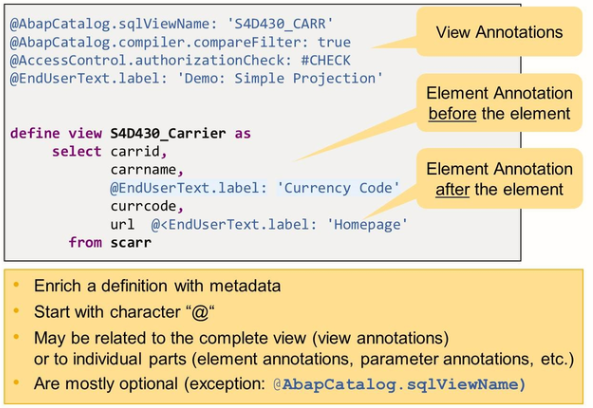 A CDS annotation enriches a definition in the ABAP CDS with metadata. An annotation is identified by a simple or structured name after leading character “@” or “@<”.