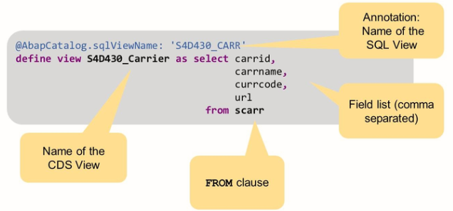 The language used is SQL DDL, but in an Open SQL form so that the view can be deployed on any database platform. As CDS views are part of Open SQL, notice also that there is no explicit client handling.