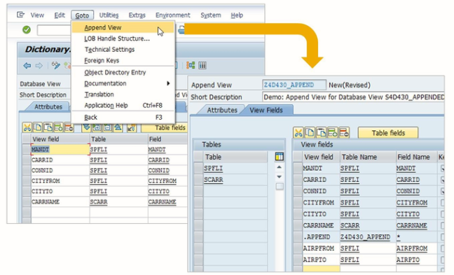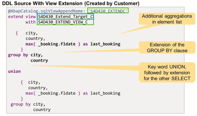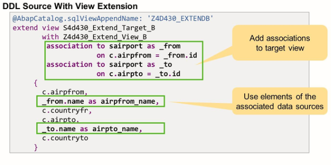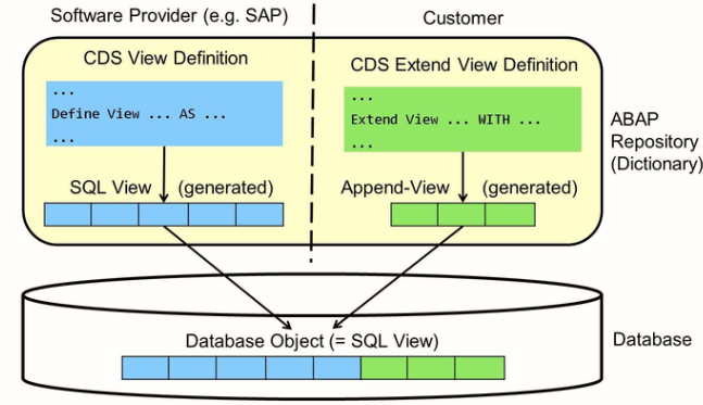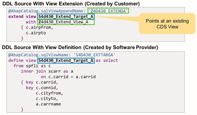 CDS view extensions are defined in dedicated DDL Sources via DDL statement EXTEND VIEW. Every DDL source with a CDS views extension defines two objects: The actual CDS view extension and an Append view. This corresponds to the two objects defined by a standard DDL: The CDS view and the SQL view.