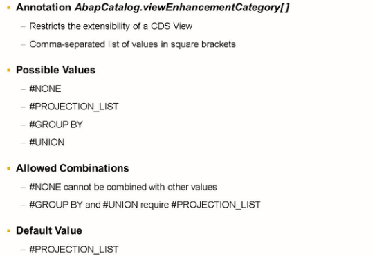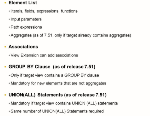 #PROJECTION_LIST: Extension of the SELECT list and additional associations are allowed: extensions of CDS view whose SELECT lists contain aggregate expressions or have a UNION clause must be permitted using further values.